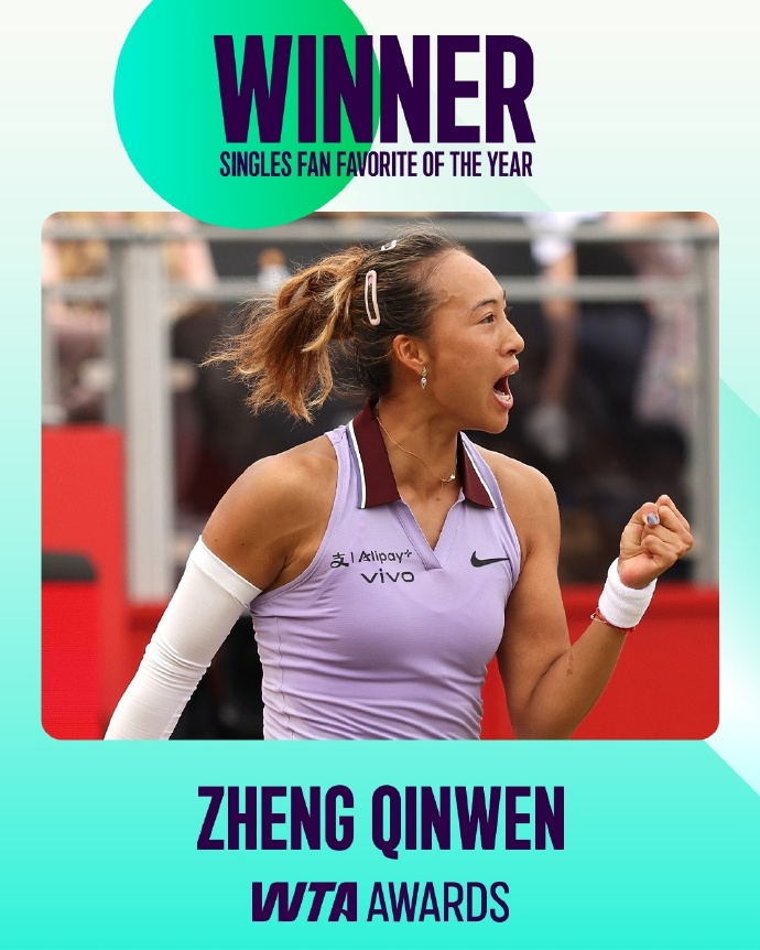 据WTA国际女子网球协会,郑钦文今年当选WTA年度最受欢迎单打球员,