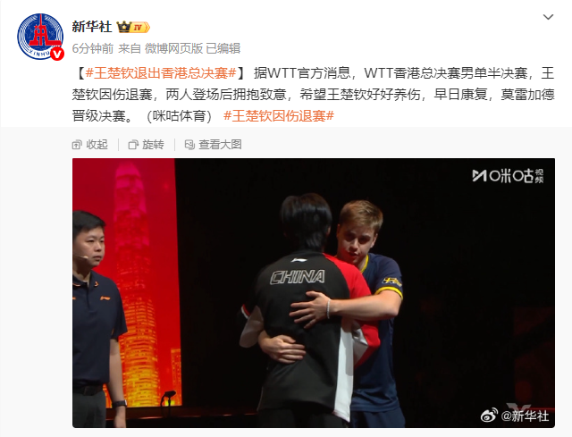 据WTT官方消息,WTT香港总决赛男单半决赛,王楚钦因伤退赛,两人登场后拥抱致意,东南亚很热吗希望王楚钦好好养伤,早日康复,莫雷加德晋级决赛。(咪咕体育)