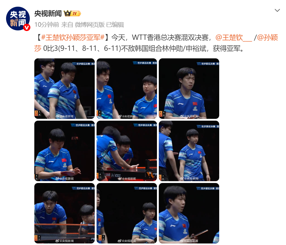 王楚钦/孙颖莎0比3(9-11、8-11、6-11)不敌韩国组合林仲勋/申裕斌东南亚肤色,获得亚军。